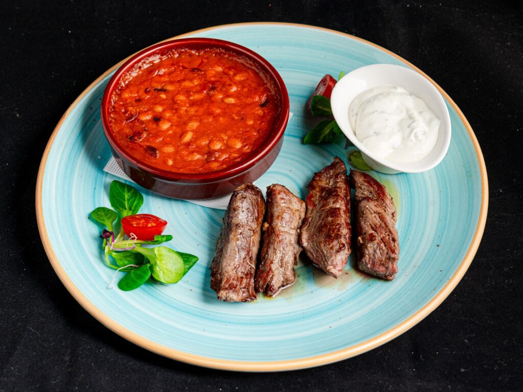 Szaftos, grillezett bárány szűzpecsenye kemencében sült füstölt szalonnás paradicsomos babbal és zöldfűszeres joghurttal