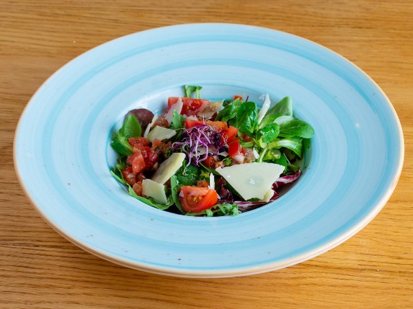 Friss kevert saláta paradicsommal, pestos olívaolajjal, parmezánnal