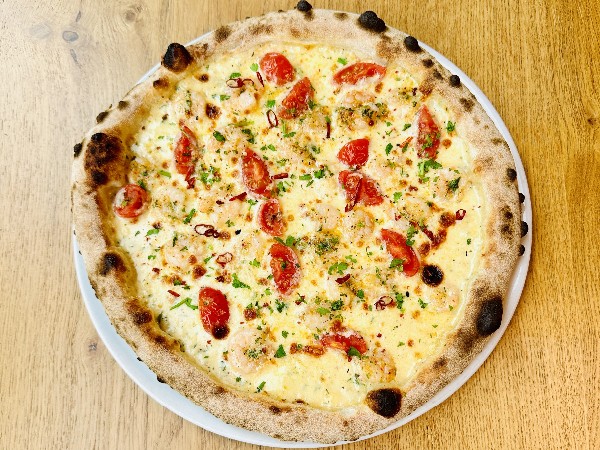Fokhagymás petrezselymes tejszínszósz, mozzarella, garnéla, koktélparadicsom, chili karikák