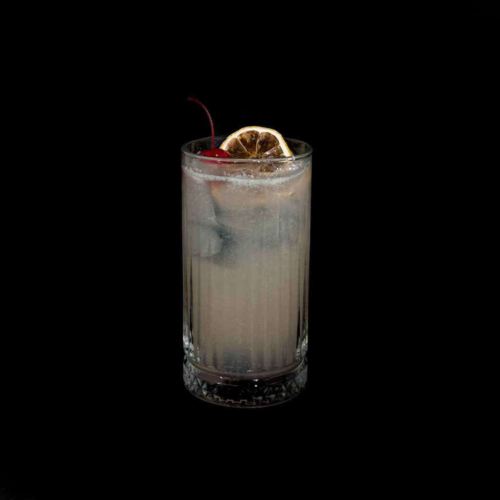 Gin, citrom, cukorszirup, szóda, koktélcseresznye